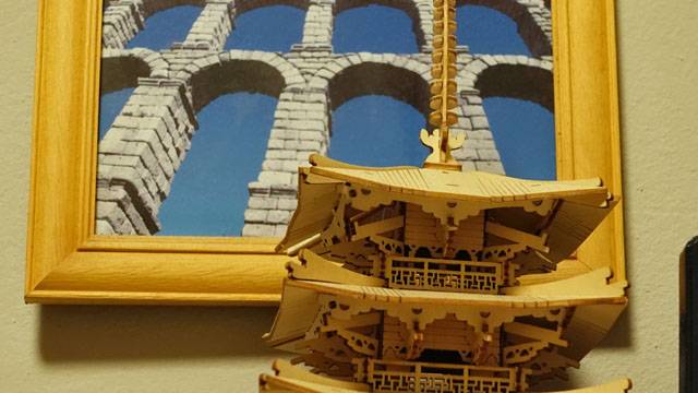 手前はペーパークラフトの興福寺の五重塔、奥の写真はスペイン、セゴビアの水道橋。五重塔は創建は天平2年(730年)だけど現在の建物は1426年のもの。一方で現存するセゴビアの水道橋は2000年前のローマ時代のもの。木造と石積の違いはあるが600年前と2000年前の違いだからそのスケールの大きさに驚くしか無い。