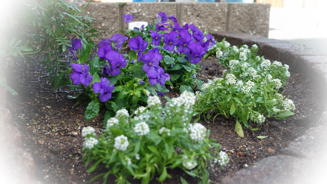 今まで空けてあった花壇の半分に前方2列分を植えた。外側はアリッサムでその内側に初めての色のパンジー、うん?ビオラかな? まあどっちみち今まで無かった濃い紫色の花びらだ。残りは後ろ2列だけど、これは後日なにかを植えることにしよう。