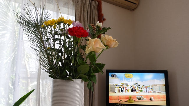 迎春のテーブルフラワー。写っているテレビは毎年年末恒例のNHKドキュメント72時間スペシャル。今年はお昼から始まって間にニュースを挟みながら、なんと夜9時まであるとか。これ見続けていたら他のことが何も出来ないぞ~。
