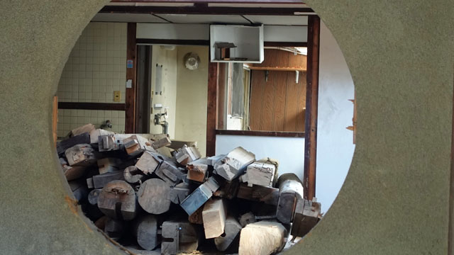数日前からアジト隣の家が解体中。重機を使うのかと思ったが、今のところ全て手作業で解体が進んでいて、もうニ階部分や一階の屋根瓦などは無い。写真は解体中の家の中に太い材木などを集めてある様子。