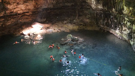 あとマヤ文明の特徴としては川がない。その代わり巨大な地下水脈があり、要所要所でこれがセノーテと呼ばれる地下のプールとなって存在している。そのいくつかは観光客が泳げるようになっているが、水深は数メートルがら10m程度。ただし、地下にあるので頭上に開けた穴から入る日差しのところ以外は真っ暗なスイミングとなる。泳いでいる魚も真っ黒だった。