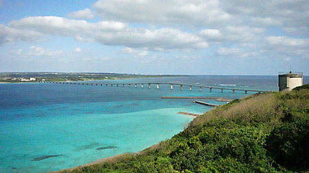 海は穏やかでブルーとエメラルドグリーンのツートンがメチャクチャ綺麗だ。宮古島には山も川も無い。島全体が浸透性の高い石灰岩で出来ており、降った雨はすぐに地下に浸透するので陸地の土が海に流れ出すことが無く、その結果、宮古ブルーと呼ばれる美しい海に囲まれることになった。今回のツアーはこの宮古ブルーの鑑賞に行ったようなものだった。